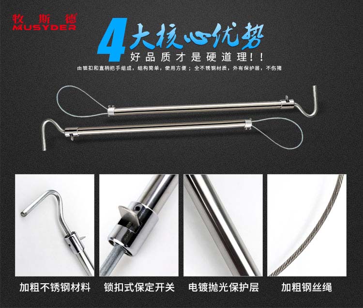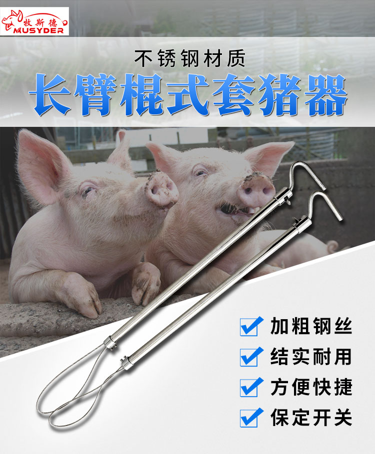 香港正牌资料大全研发出一款兽用长臂棍式套猪器,专为猪只保定而生,有了它,轻松高效保定不是梦。香港正牌资料大全套猪器采用不锈钢材料制作,进行加粗4毫米,更加耐用不易断裂。整体优化,进行了电镀抛光保护设计,整体防磨防锈,使用寿命长达好几年。在把手方面,进行了钩状把手设计,可直接挂于栏杆,猪只保定轻松不费力。